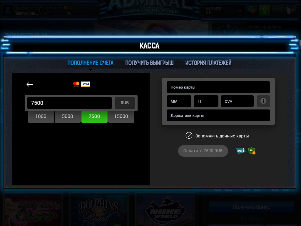 По обзорам и отзывам игроков, более 10000 рублей невозможно вывести из клуба Адмирал777 без подтверждения аккаунта. Для этого администрация сравнивает информацию в профиле с данными по счету. Если сотрудников онлайн казино, что-то не устроит, они отклоняют вывод и требуют от игрока подтверждение личности. Как правило, для этого нужно отправить сканы паспорта или фото кредитной карты, если перевод отменили на кредитку. Чтобы узнать, как быстро подтвердить аккаунт и не столкнуться с проблемами можно связаться с техподдержкой.