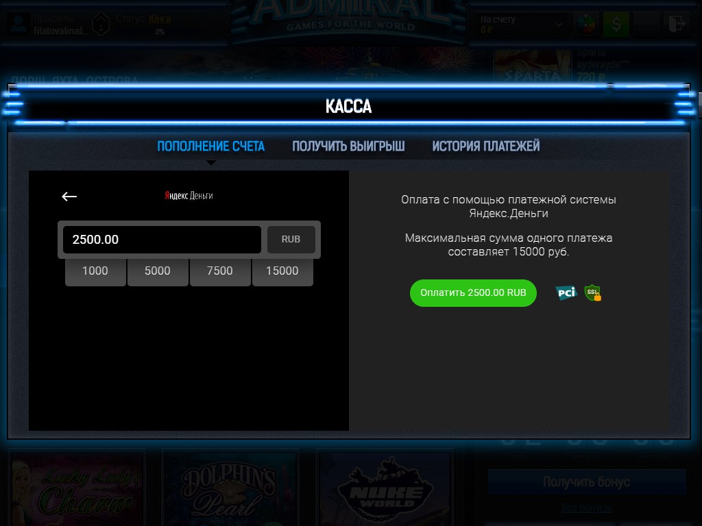 Заведение Admiral, пожалуй, одно из самых удобных в плане игры на слотах, ведь сорвать куш можно даже с минимальном депозитом. Здесь он составляет 250 рублей и столько же можно вывести со счета. Меньше не получится ни закинуть на счет, не забрать. При этом цифра достаточно лояльная по отношению к игрокам и даже новички смогут что-то выиграть выиграть в игровых автоматах и получить средства из казино на карту.