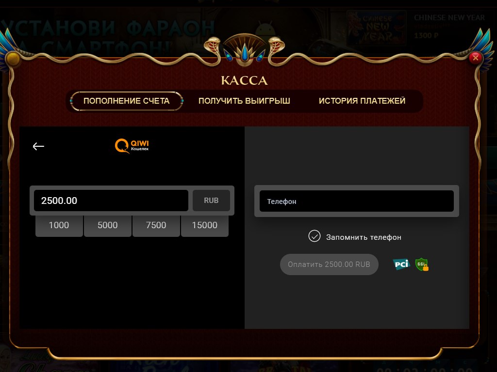- войти в раздел «Касса» в главном меню казино Фараон;